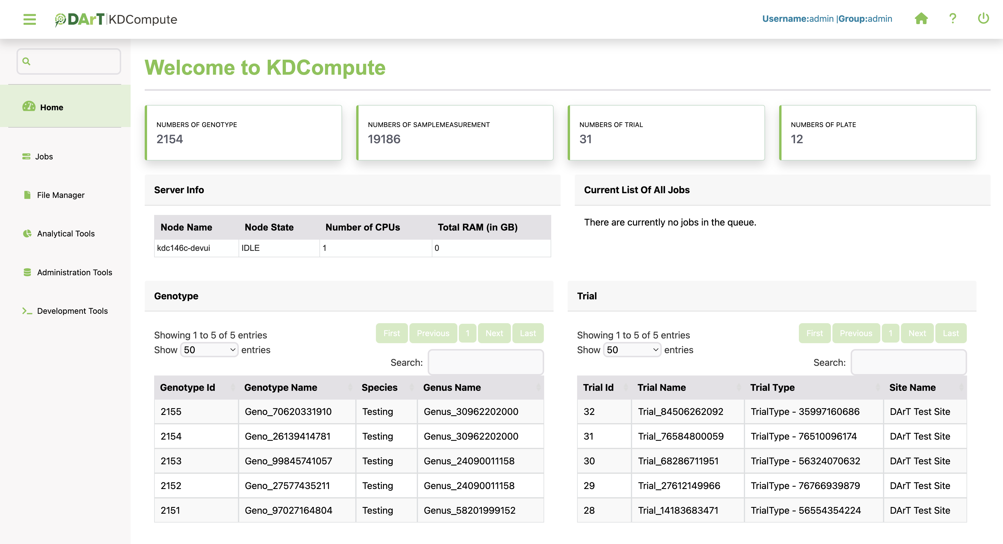 The KDCompute application provides any type of analysis of data stored KDDart which is accessed via mature API referred to as the Data Access Layer. KDCompute executes any analytical procedure, including basic breeding program calculations and mixed model data analysis (Standard Trial Analysis (METAR)).