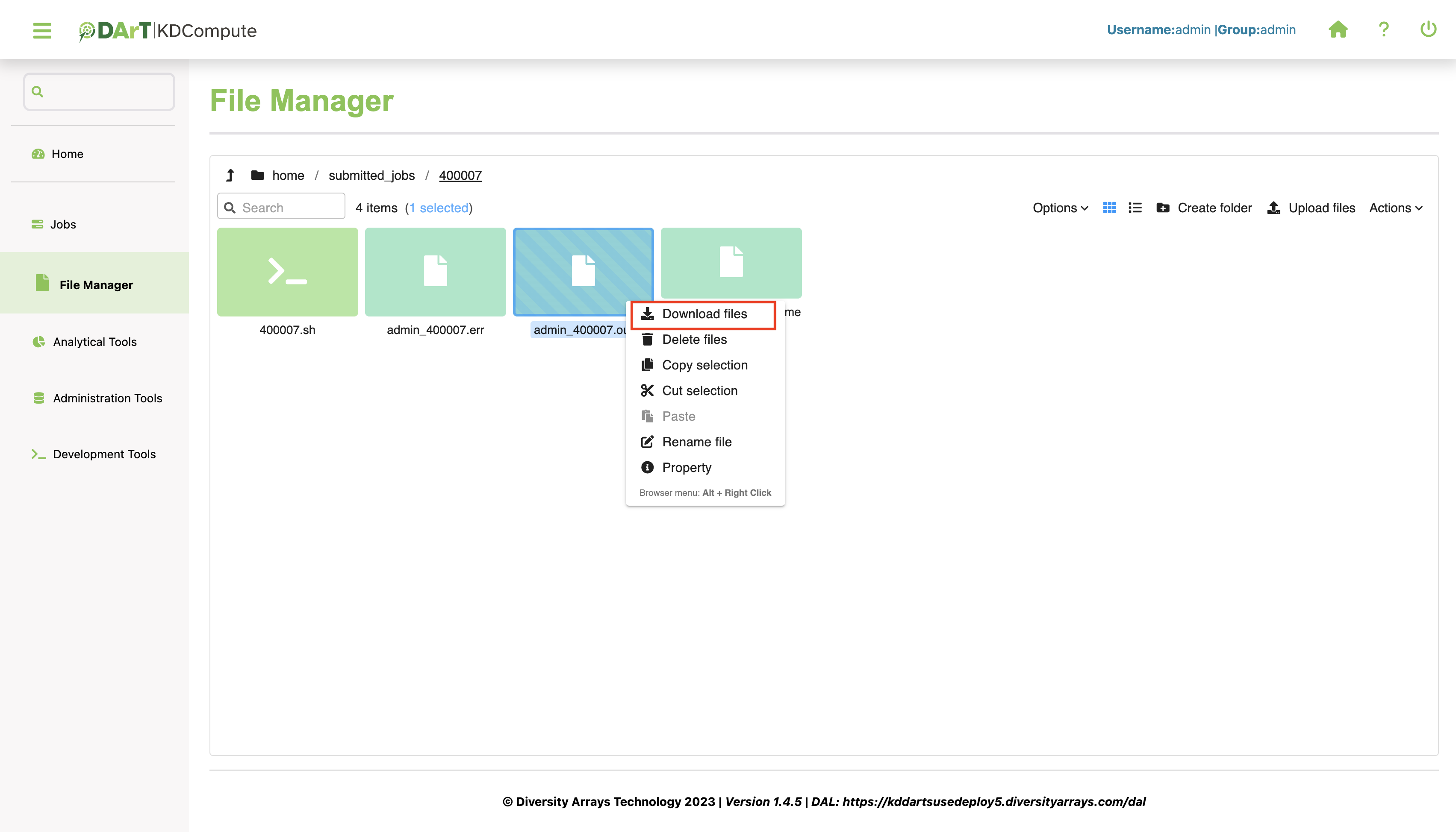 Output files produced by an algorithm can be downloaded from the server to your workstation when the job has completed. The following steps outline how to download a file in KDCompute: